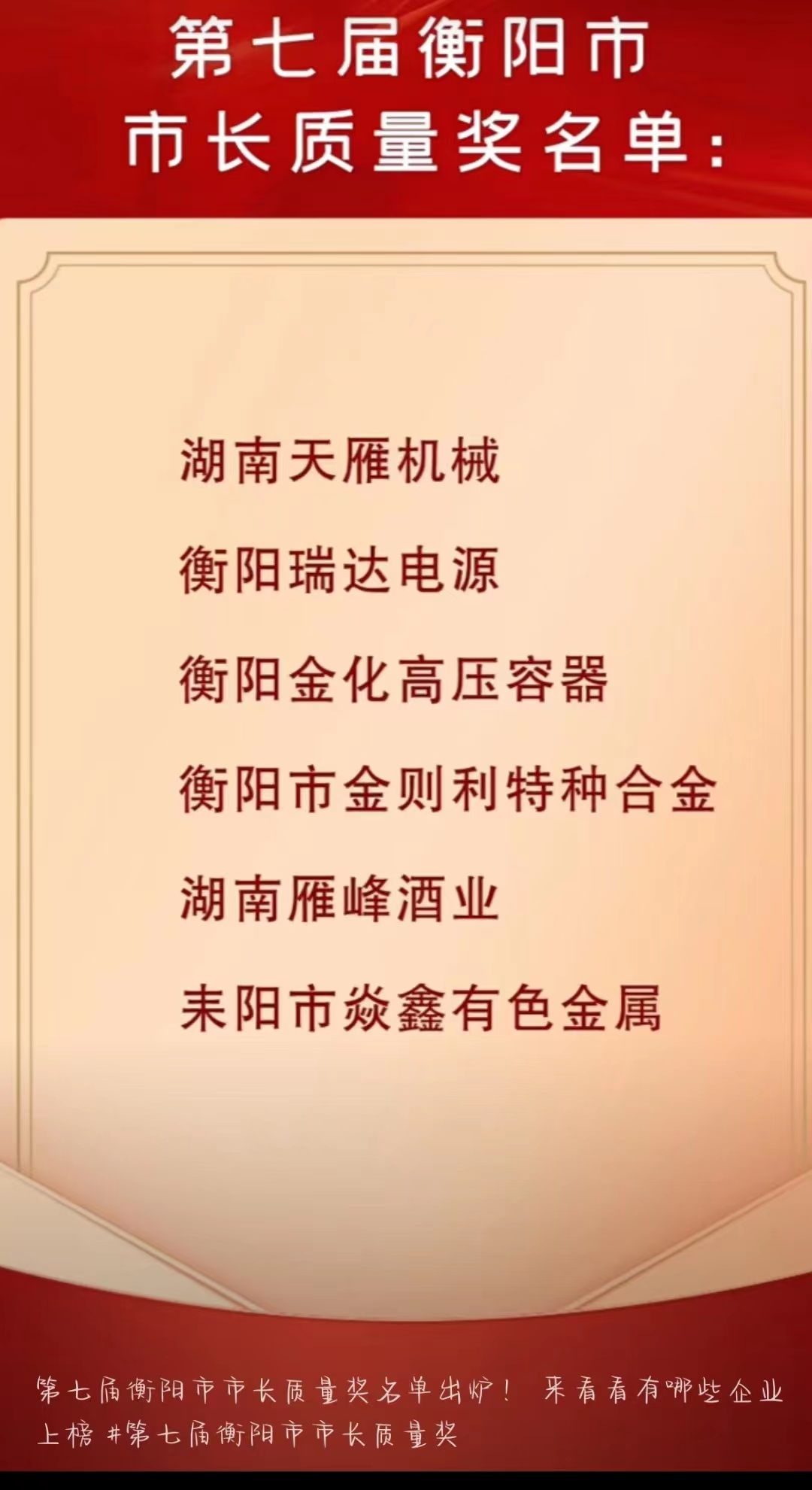 公司榮獲衡陽市第七屆市長質(zhì)量獎(jiǎng)